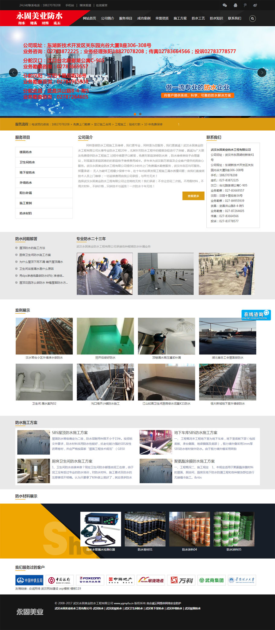 武汉永固美业防水工程有限公司法人张光荣1968农村出生,93年毕业于湖南工程大学,94年至95年在武汉四建工程公司工作,指导防水监督,96年自己拉起一支5个人的防水队伍,2002年成立了注册武汉固强美服务部,陪养了22名技术过硬防水师傅,2006年注册武汉永固美业防水工程有限公司,注册资金200万,技术师傅有35名,2013年成功申请由湖北省建设局颁发的贰级建筑防水资质证,武汉各区多有分站点,公司服务宗旨质量加质量,业务不愣大小,只要你一个电话我们免费上门为你勘察出方案,补漏优势; 我们公司有先进漏水检测仪,可以准确无误的测出地下自来水管漏水点位置。对于不同的漏点有多种机器补漏设备,有着过硬的技术,才可以保证质量的通关,我们坚信好的质量就有好的口碑,企业的成长和质量是密切相关,承接业务为了企业利益,接受了你们的业务赚一千赚一万是我们份内的事情,保证质量是我们的原则。我们不会因为某个单子业务报低价去偷工减料在从工料中获得利益,赚钱要赚的心安,防水事业好比针挑手刺一点马虎不得,水无孔不入,差的质量和做工当时可能不漏,过个两三年肯定会渗水,我们不敢说自己质量第一,但敢说质量好。到业主施工师傅都有5年以上工龄,经过公司反复考察人品和技术合格后才可以去上位施工,公司奖罚分明,对于施工大意保修期内造成漏水事故,惩罚力度很大,扣除半年奖金。公司一路走来这些年头感谢所有员工的支持和团结,也感谢各位业主的介绍,到目前公司员工有86名,防水补漏设备16台,漏水检测设备3台,防水材料仓库3间,欢迎各界人士来电咨询,我们将一如既往的为武汉人民服务